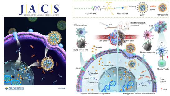 近日,公司孙勇教授和中国科学院化学研究所肖海华研究员合作,在铂药核靶递送和免疫增强研究方面取得最新研究进展。相关研究成果近期以“Nuclear-Targeting Lipid PtIVProdrug Amphiphile Cooperates with siRNA for Enhanced Cancer Immunochemotherapy by Amplifying Pt-DNA Adducts and Reducing Phosphatidylserine Exposure”为题发表在Journal of the American Chemical Society(JACS,DOI:10.1021/jacs.3c12706)封面文章。本文第一作者为公司青年教师魏登帅,通讯作者为孙勇教授和肖海华研究员。